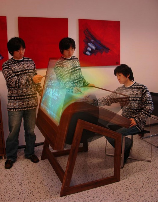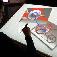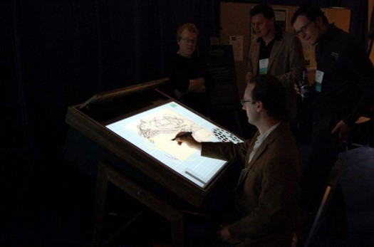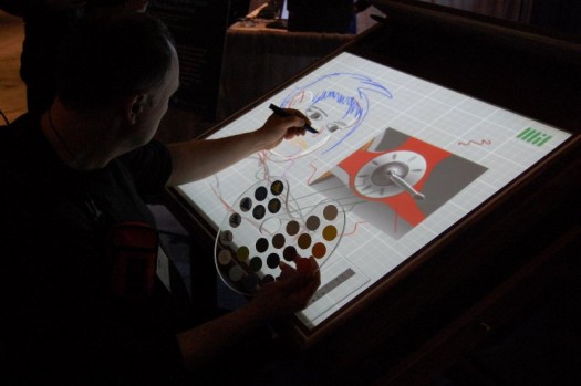Along with the touch and pen input, they augment the table with other physical devices. You see some of this in the video above, but also in this picture (taken at the CHI conference), where an “artist palette” contains color and line weight swatches. Because the pen has a camera in it, you can switch colors and line weights just by touching the pen on the palette. THIS is absolutely BRILLIANT.