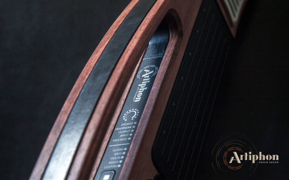 The Instrument 1 is a multi-instrument ‘musical controller’ that uses the iOS app platform. It offers four playing positions, each simulating different instruments: in front of you like a guitar, under your chin like a violin, upright like a cello, or flat on a table or lap for piano/drumming/dulcimer action. The player interacts with two sensor panels – one for strumming, plucking, and bowing motions, and the other as a six-string fingerboard (or drum kit). Both can detect speed and pressure, thus providing a realistic and responsive playing experience. Do you have good vibrato? – that comes through. Fast finger-picking? – that too! The technique developed from actual instrument practice can be used on the Instrument 1.