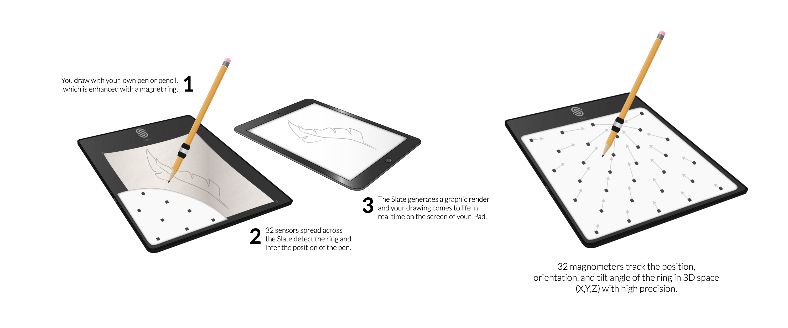 The Slate itself is essentially a magnetic tablet of sorts that is able to track the movement of a magnetic ring on your drawing implement (pencil, pen, marker, etc.) using a series of magnometer sensors (32 in all) housed beneath the tablet face.