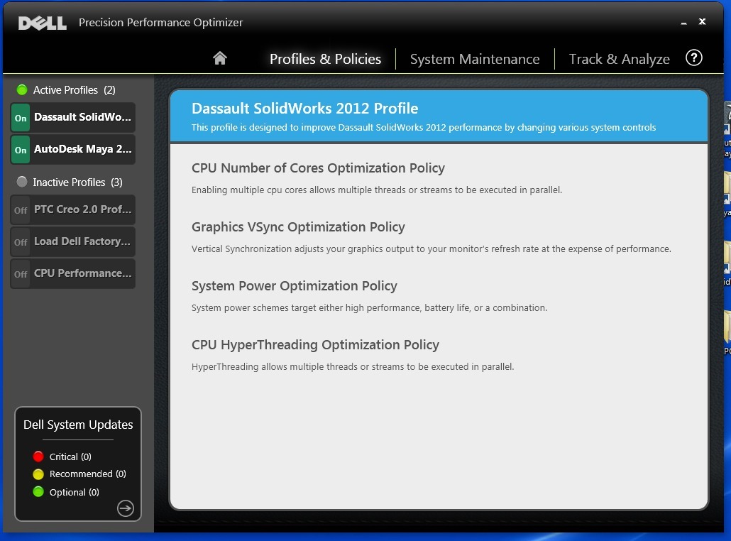 Dell Precision Performance Optimizer is free and is pre-installed on Dell Precision T1650, T3600, T5600,T7600, M4700 and M6700 workstations with Windows 7 (32 & 64 bit) and Windows 8 (64 bit) operating systems and is also available for download here. Application profiles are currently available in English for Autodesk Maya, PTC Creo, Dassault SolidWorks with Adobe® Premiere® Pro, Adobe After Effects®, Adobe Photoshop®, and Adobe Media Encoder® and other profiles available soon. French and German languages will be available for download in the coming months with other languages available later this year.