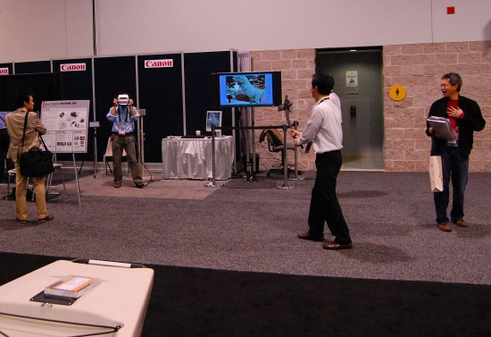 Kirk mentioned Canon’s Mixed-Reality system above. Here’s a shot of it displayed at SolidWorks World 2010. It allows you to view and interact with virtual objects in the physical environment. It’s the next step past your reality simply being augmented to display data by bringing in interaction with that data.You can see the guy watching on the left is not convinced invisible dinosaurs are about to eat him, while the guy watching on the right is having trouble catching his breath from sheer amazement. They both battled each other to the death, right after I took this picture.