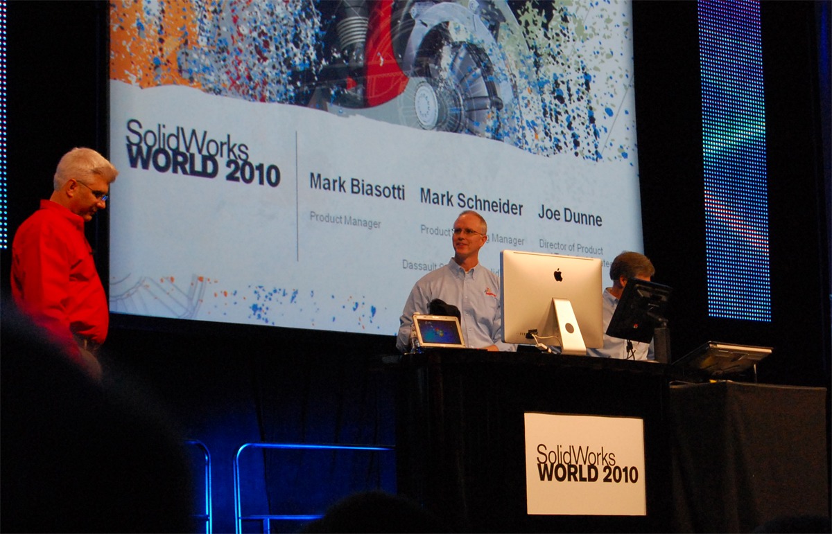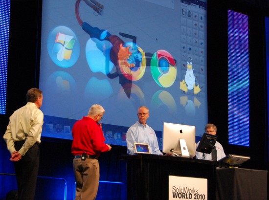 SolidWorks 2010 already has some multi-touch capabilities. As with many programs, it mostly involves command access and viewing (pan, rotate, zoom.) The only 3D CAD program which currently allows you to manipulate geometry using multi-touch gestures is SpaceClaim. I, literally, got my hands on it last week and will be spilling my thoughts about that very soon.