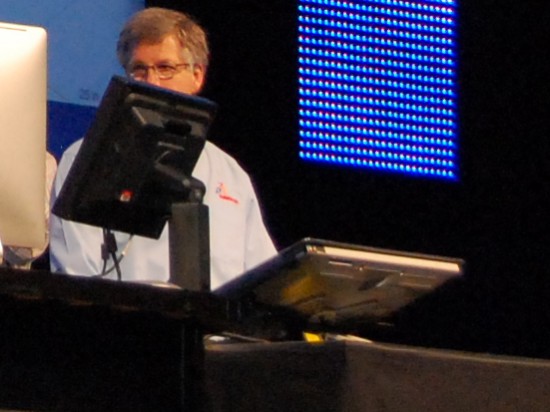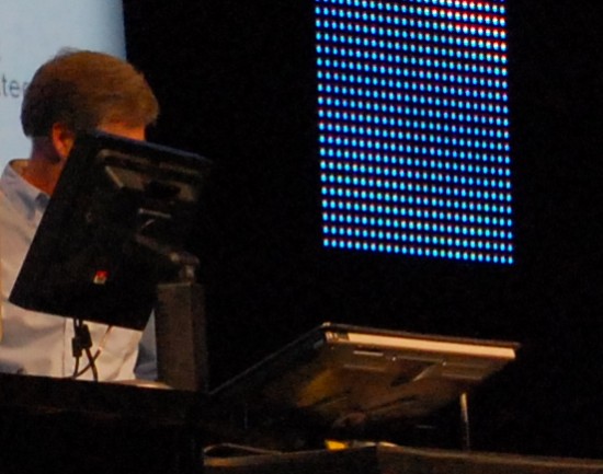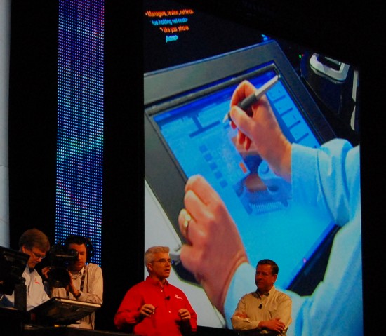However, what’s supremely interesting is not the multi-touch, but the device being multi-touched. It’s what we thought looked very much like a Wacom 21UX Cintiq. EXACTLY like one, except one major difference. It had both stylus and those fancy multi-touch capabilities.