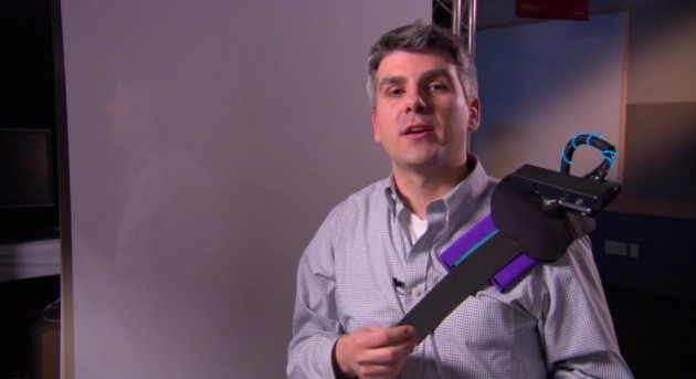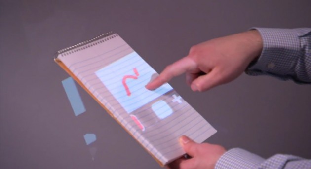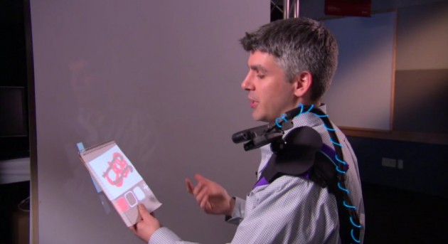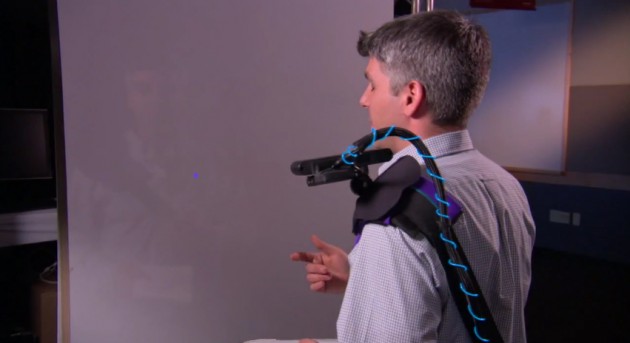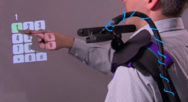 This wearable multi-touch unit you’ll see in the video below straps to your shoulder, uses a depth-sensing camera and a small projector to simulate the interactions. By sensing your surroundings, or rather the projection surface, it can auto-adjust the size of the touch sensitive area.