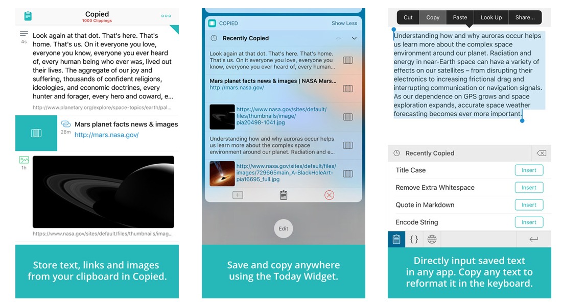 Copied is a full featured clipboard manager. Save text, links, and images that you’ve copied to your clipboard from any app. Quickly copy your saved clippings from the Copied Today Widget or input them directly into any app using the Copied Keyboard.