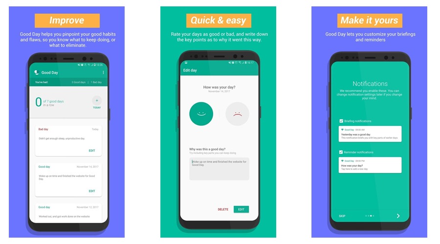 Forming positive habits are essential to a happier life, and Good Day is an app that helps you efficiently improve yourself.