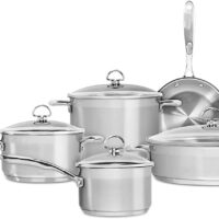 This is possible with the five-ply base of the entire cookware set, which features an entire copper plate sandwiched between two layers of aluminum. On the other hand, the exterior has an induction-capable stainless steel encapsulator that allows the cookware to work on all cooktops, even induction.