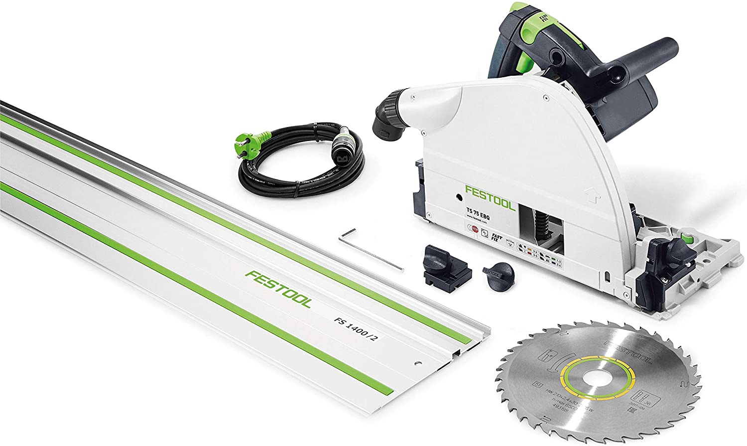 This Festool track saw comes with a guide rail FS 1400/2, return stop; HW universal saw blade W36, and an operating tool. It is perfect when used in cutting doors. It is a precise plunge that cuts up to 75 mm material thickness. Has a quick-acting brake for comfortable and safe working. There is also a spring-loaded spacer wedge that ensures unhindered plunge cuts.