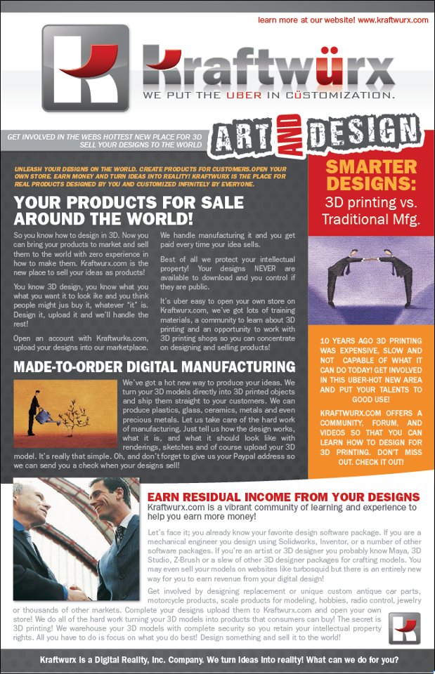 It’s been just over four years since Digital Reality, Inc. made a rumbling about, what was at that time, the first web-based 3D customization to appear. Of course since then, countless online customization sites for every sort or 3D digital design has been established. Now, Digital Reality is back, with a new plan and a new name for their new online customization portal, KraftWurx. They are currently signing up service bureaus with plans to bring on designers in two to three weeks. However, there is something strange and a backstory to all of this that is sure to add a little drama to the 3D printing scene.