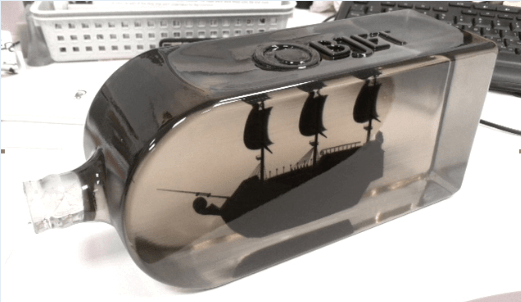 The design features a solid (as in, solid all the way through) bottle, 3D printed in Objet’s Clear Transparent material. Suspended within the Clear Transparent material is a sailing ship design printed in 30 micron layers in Object’s Black material, allowing precise details such as masts, railings, and flag poles to be distinctive with their traditional features.