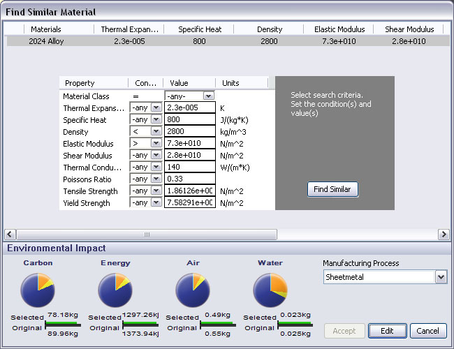 It brings in the properties of the material you have selected. Then, you can very quickly select different materials or change properties of the existing material to find other options. After hitting the Find Similarbutton a list of materials appear according to what you have selected. When double-clicking on any of them, the environmental impact section will update instantly.