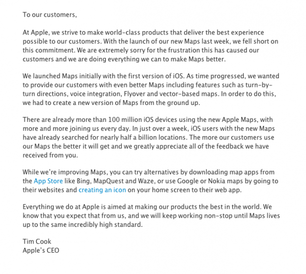 It’s been said that Scott may have been a difficult person to work with, continuing to use his relationship with Steve as a power-play move as well as becoming increasingly difficult to work with. But from a product-based perspective, perhaps this decision was built upon the company-wide letdowns that were antenna issues and Siri, among others, but the latest blow is undeniably the poor execution of Apple’s own Maps app for iOS 6. What was supposed to be (and advertised as) revolutionary ended up being a poor execution of recreating Google’s map app—and while there are great features (Vector graphics, 3D aerial views, GPS directions), the old saying “You’re only as strong as your weakest link” comes into play here. Distorted graphics, misinterpreted address locations, and buggy performance stalled Apple’s dreams of freeing themselves from Google’s grip in the iOS sector, to the point of having to hire Google Maps engineers to fix the problems. While Tim Cook took the blame as CEO, a large majority of the blame falls on Scott’s shoulders–and he apparently refused to sign Apple’s public apology letter: