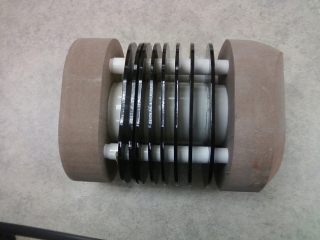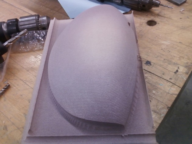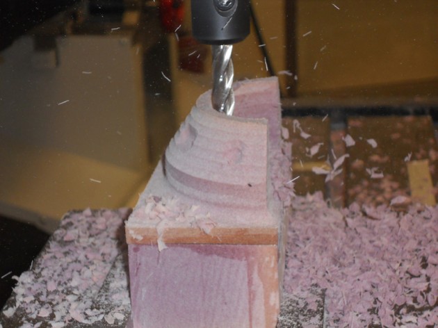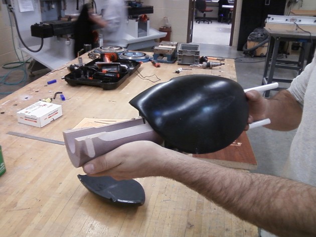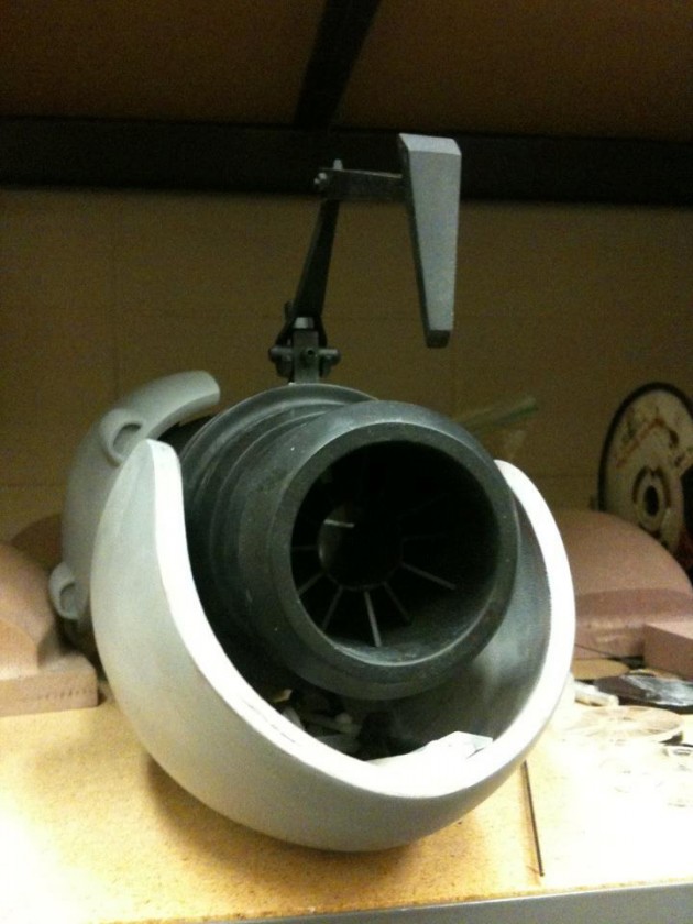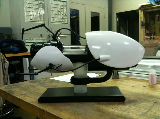 Logan and Stephan used a mix of CNC, SLA, laser cutting, vacuum forming and casting to re-create the Portal device. The CNC parts included the trough, collar, front and back of back tube and part of the barrel, smoothed out with the lathe. The removable side shells were also CNC’d in four parts, then vaccum formed with three layers of 1/8 inch styrene, finished off with a laminate over the top of each. This was all cut from from tooling board. The “apple cutter” on the inside was also CNC’d with the fins being laser cut from clear acrylic and the back tube has two parts that were CNC’d wrapped with styrene around the skeleton.