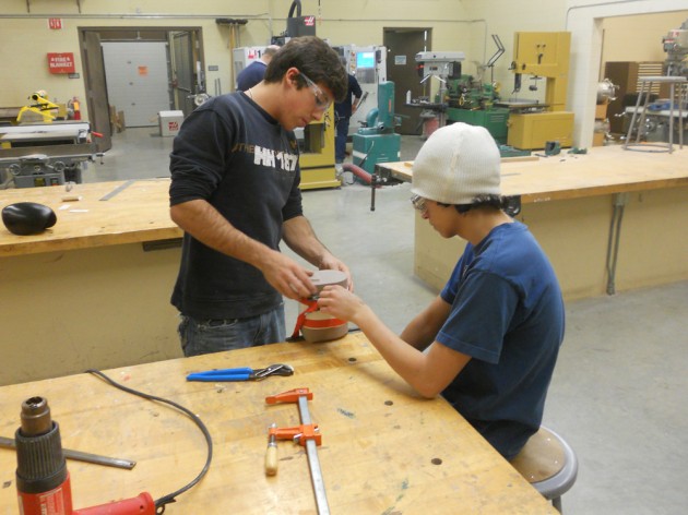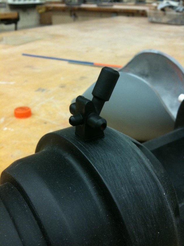 The sections that attach to the tube were lathed from aluminum, then cast. The wire bracket mount was then lasercut to fit 16 gage wire and piano wire bent accordingly. The caps on the shells were also lasercut then formed with expanding foam and body putty. The light tube is acrylic tubing with a glowstick that was sandblasted and cut to fit the small spot with all the fins lasercut from 16th clear acrylic. Here are just a few shot of how the project came together, with more on Logan’s Flickr page.