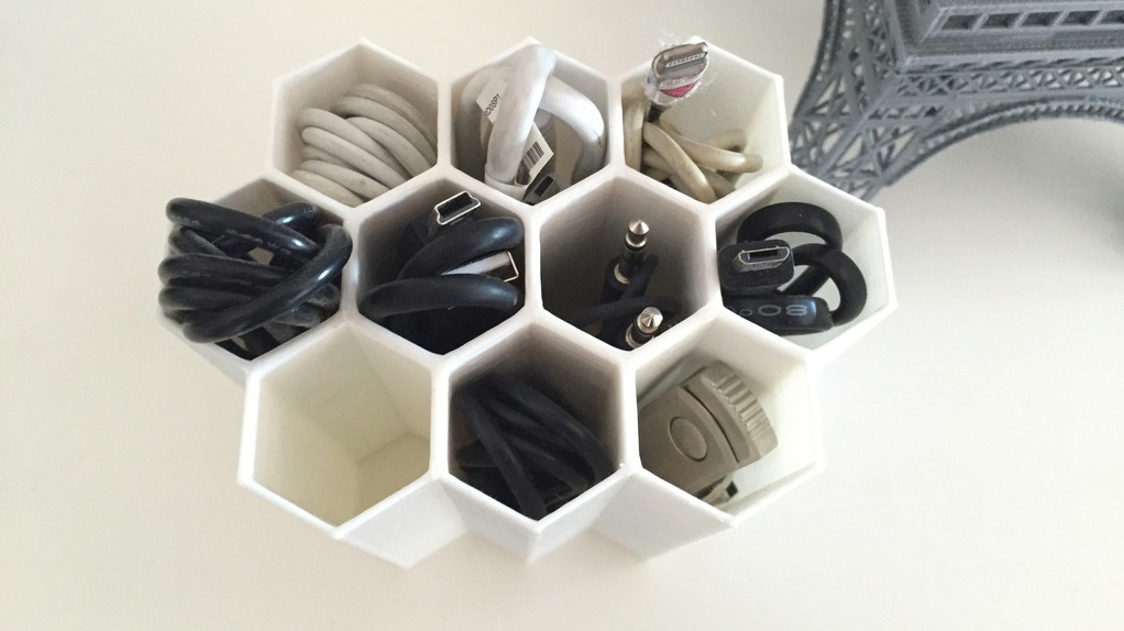 Sure, you could buy cable wraps, cable ties, or hire a butler to keep all that in order for you, but that’s just too costly, especially when that butler starts giving you lip about having too may charging cables. Instead, Thingiverse user Juanfly has a handy storage solution to keep all your wires in one place. The Cable Management Hive is ten tiny honeycomb compartments to hold cables, thumb-drives or other sundries and notions laying about your desktop.