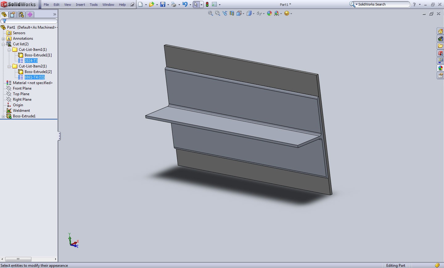 Separate materials for multibody parts was a feature slated for 2009. It got pushed back, but now it rears it’s mighty claws in SolidWorks 2010. You can now set different materials for different bodies in a single part. This is huge if you have materials with different densities in a single part, or if you’re creating a weldment with different materials as shown below.