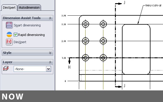 The first thing mentioned in the email, the half-blue, half-yellow circle, is the Rapid Dimension tool. It made it through SolidWorks 2010 beta, and soon became the bane of many a dimension laying drafter. An option to toggle it off or on was added in SP4. That’s four updates after beta, not including multiple betas and early visibility releases.
