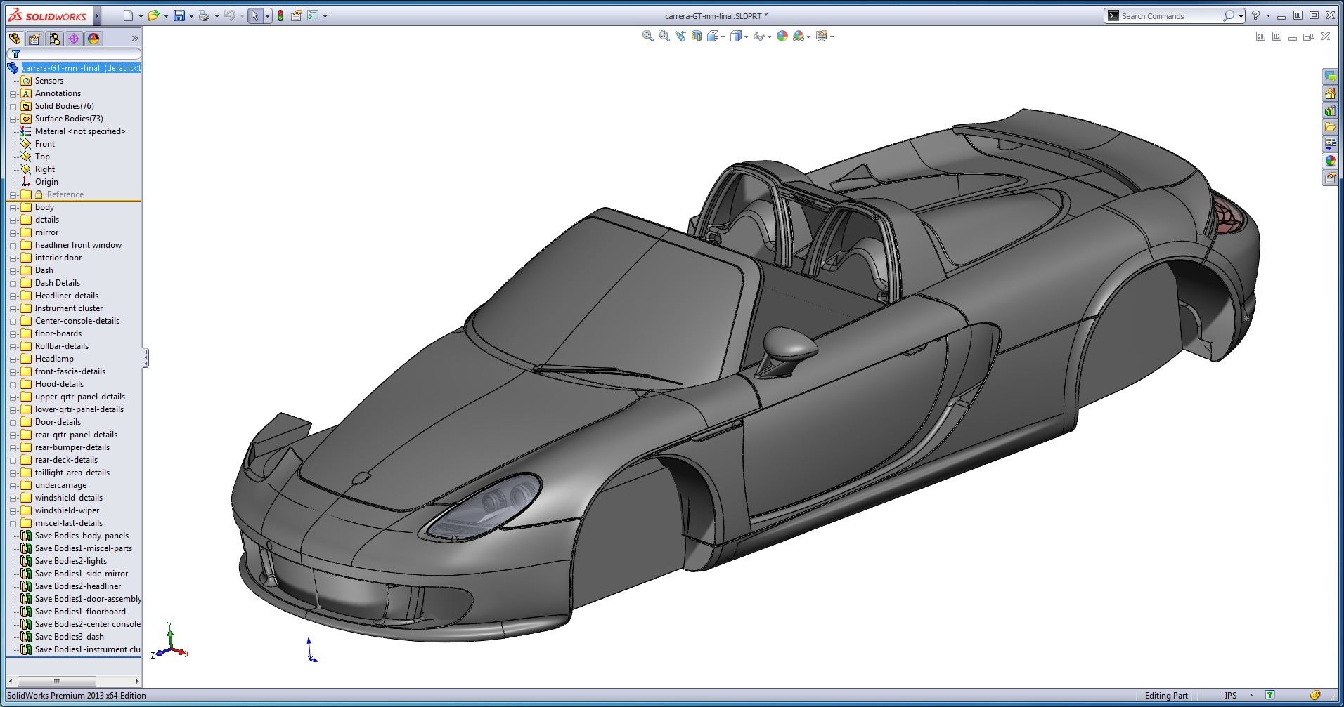 Some would rather drive down Route 1 in a Porsche Carrera listening to Tiesto instead of modeling the exotic convertible in SolidWorks. If, however, you desire the later, you’ll want to pause your SolidWorks surfacing infusion and jab this into the base of your neck. In a previous post, Mark Biasotti detailed the desire to model the Porsche Carrera GT, taking on the challenge of building the entire surface of the exterior and interior. Of course, a full SolidWorks model of such a car, by such a master, would be a high demand item. So, the week after he told his story, he posted all the files for the car, including the full “2500+ feature beast” that you can roll through till your mouse-clicking finger pops off.