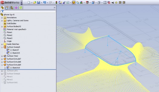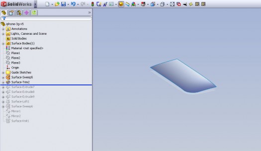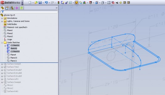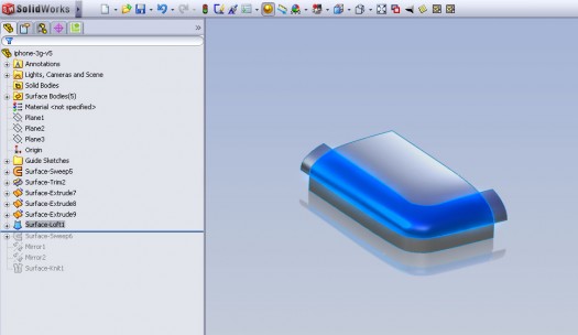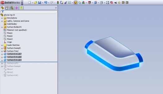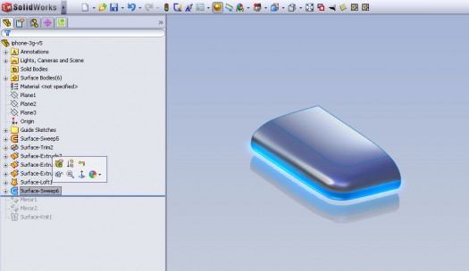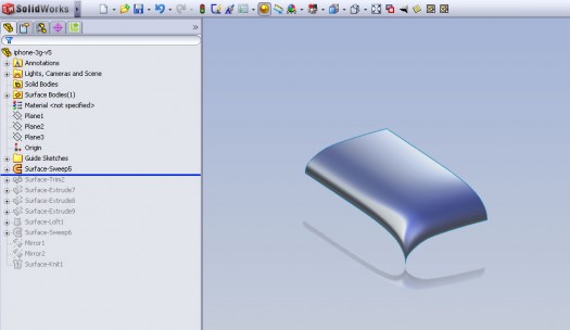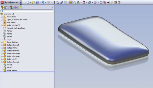 You’ll quickly realize, when creating surfaces in SolidWorks (or anything else really), is there many ways to approach a modeling situation, a lot of settings you need to be familiar with, a lot of tweaking of splines and settings and a lot more features than should be necessary to create something as ‘simple‘ as an iPhone. The method above is just one way. You could also try a combination of boundary surfaces and surface fills or you could start off with lofted surfaces. There’s plenty of ways to go about it.