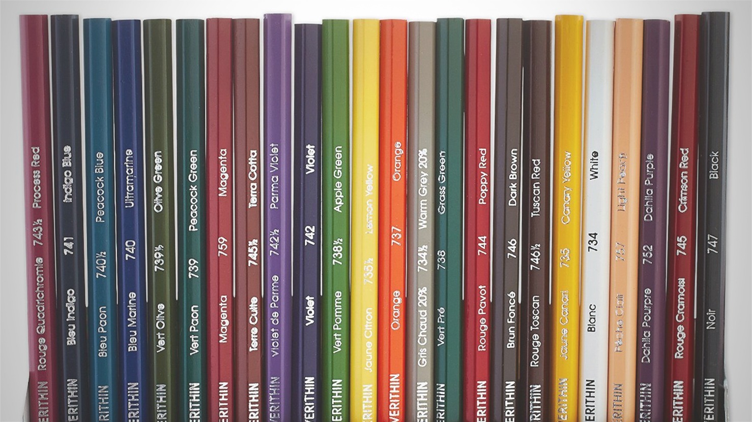- Includes: Lemon Yellow, Canary Yellow, Orange, Poppy Red, Crimson Red, Magenta, Process Red, Light Peach, Dahlia Purple, Parma Violet, Violet, Ultramarine, Peacock Blue, Indigo Blue, Apple Green, Grass Green, Olive Green, Peacock Green, Terra Cotta, Tuscan Red, Dark Brown, Warm Grey 20%, White and Black