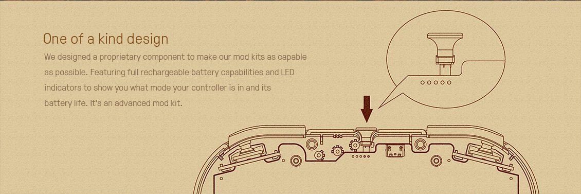 One key component is a little nub on the top which allows users to recharge the controller’s 3.7V 180mAH lithium-ion battery while displaying remaining battery life. A fully-charged battery will enable a user to play for 7 hours straight before requiring a 1-2 hour charge. The nub also doubles as an LED indicator showing what mode your controller is in.