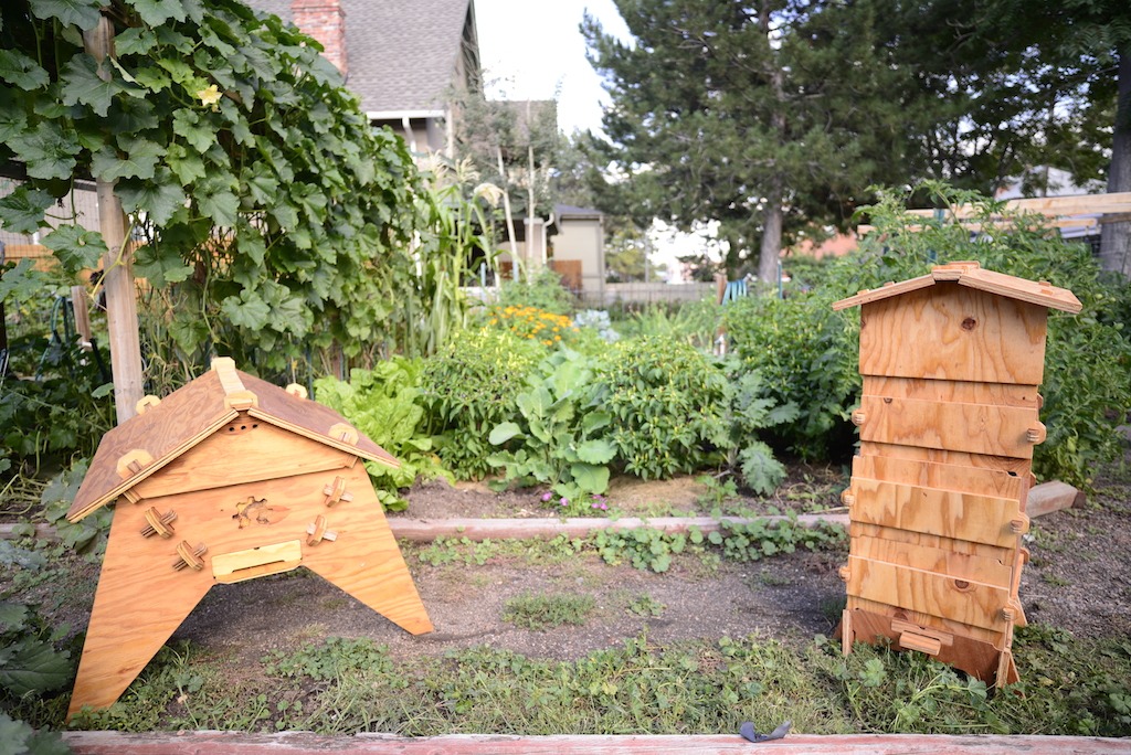 The hives are a modification of top bar hives developed in Kenya. Because African honeybees are more aggressive than their European and North American counterparts, a top bar hive places the honeycomb part of the hive above the colony, so fewer bees are disturbed when it’s opened. It keeps the bees calmer and makes for easier hive inspections.