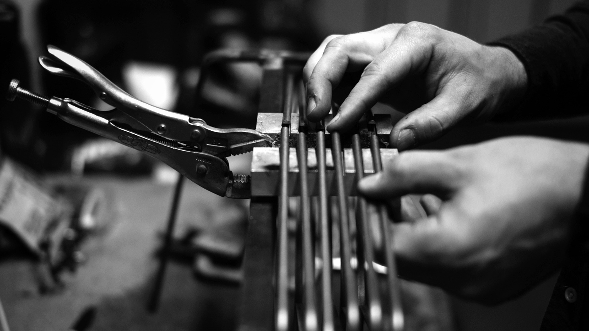 From here Ken hand forms the split hooks into their final position utilizing jigs and tools he fabricated.