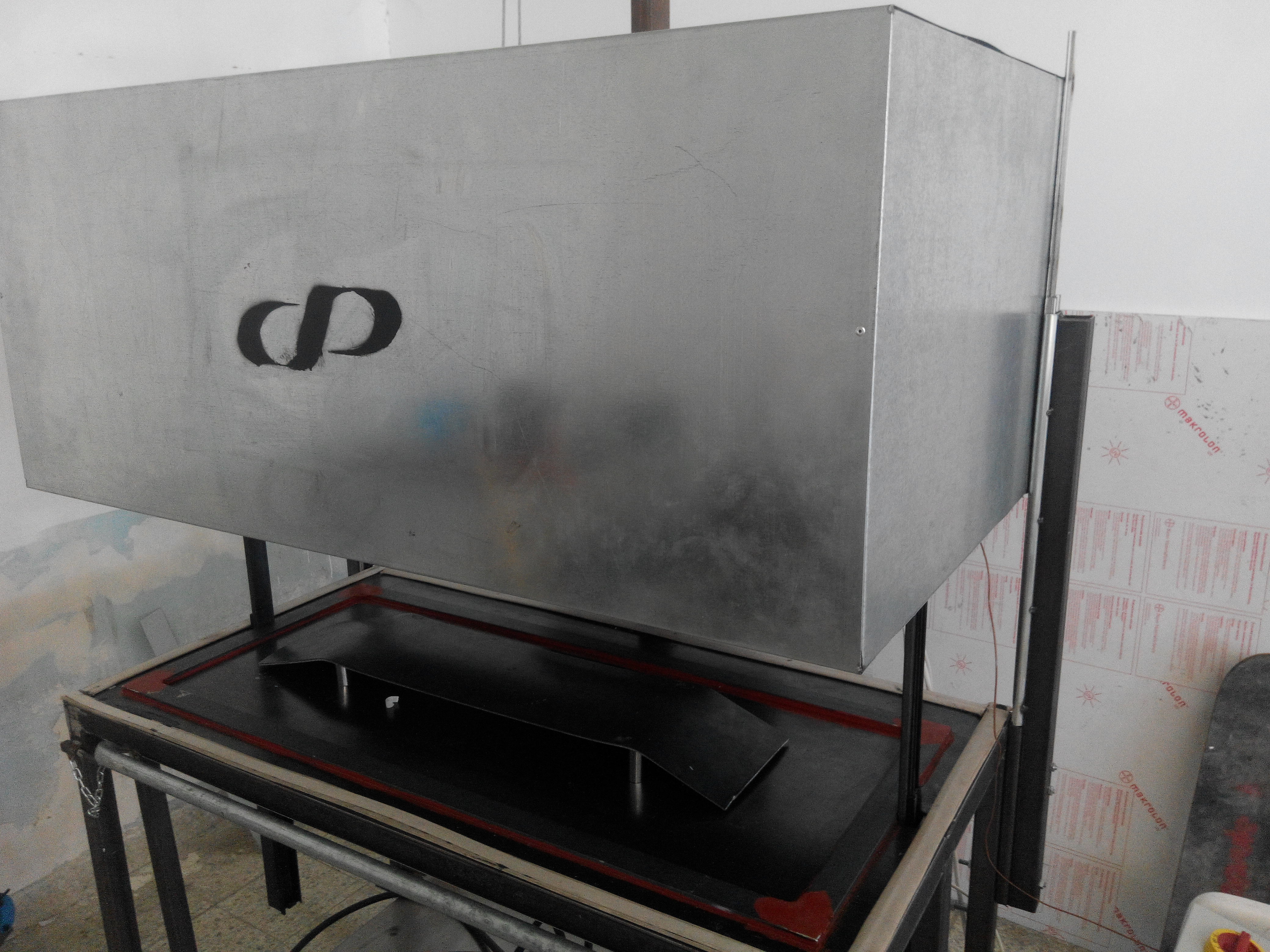 His initial prototype was very rough. Using the crudest means possible, he folded a 0.20 square meter panel of undisclosed material with heavy duty clamps in order to make it vaguely skateboard-shaped.
