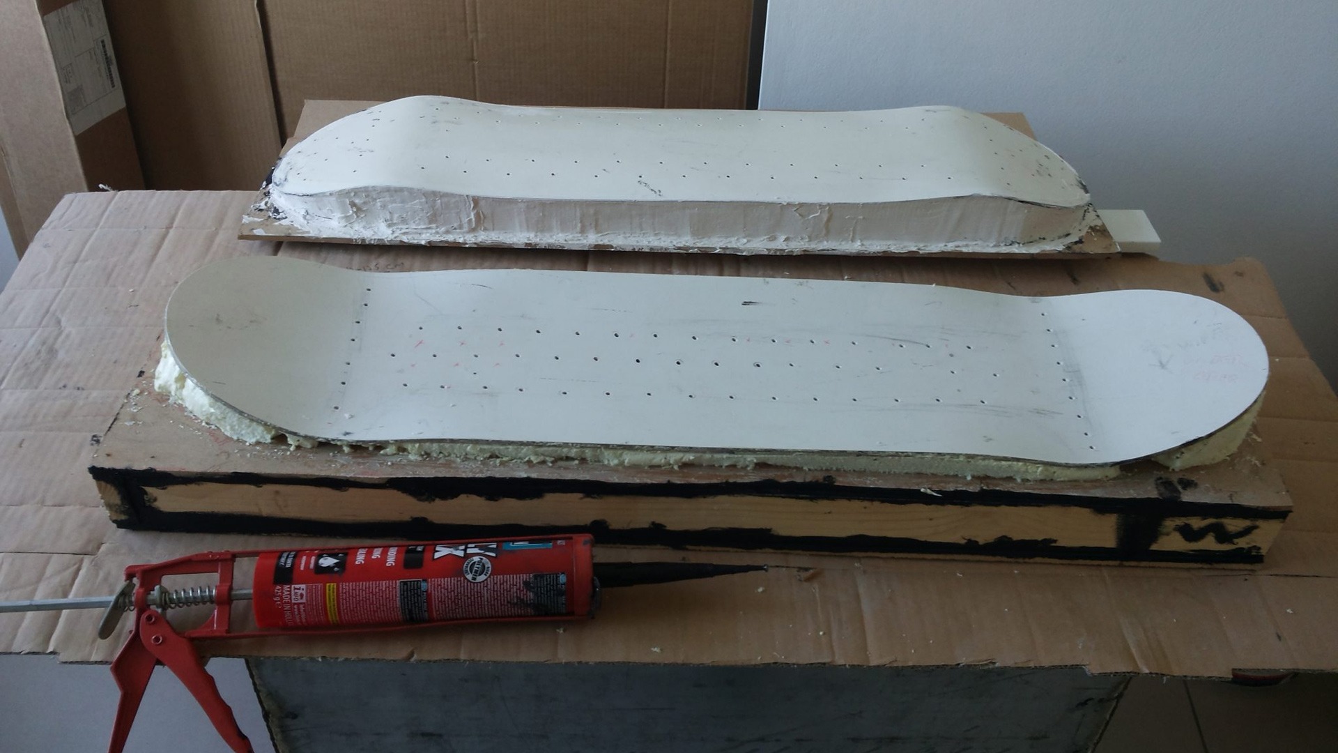 His initial prototype was very rough. Using the crudest means possible, he folded a 0.20 square meter panel of undisclosed material with heavy duty clamps in order to make it vaguely skateboard-shaped.