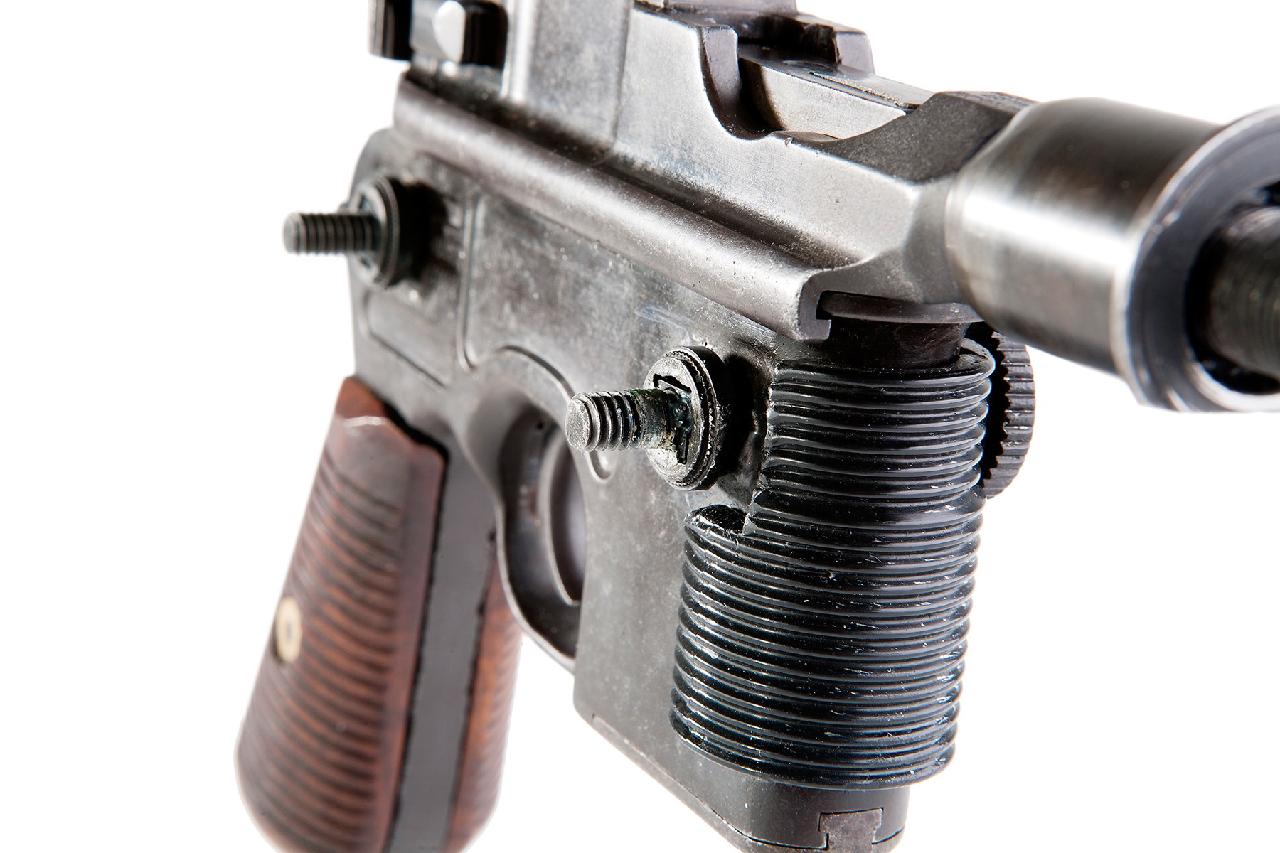 The little things that make up the Han Solo blaster are of equal importance, so much so they have their own word in the prop-making community: greeblies, which is defined in Industrial Light and Magic founding member Lorne Peterson’s book “Sculpting a Galaxy: Inside the Star Wars Model Shop” as, “miscellaneous mechanical details that add realism to a prop, model or set.” There are heat sinks (commonly referred to as the grill) that wraps around the front edge of the blaster’s magazine well, a circular-shaped silver disc on the left side of the magazine well, which some theorize wasn’t adornment but a mere reflection from a camera flash when the prop was being photograph—hence its innocuous name “the mystery disk.”