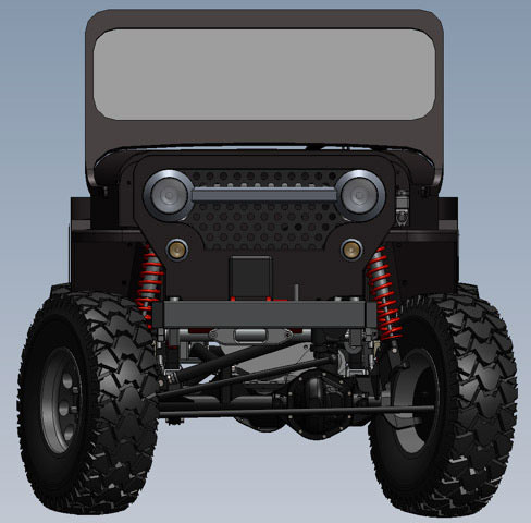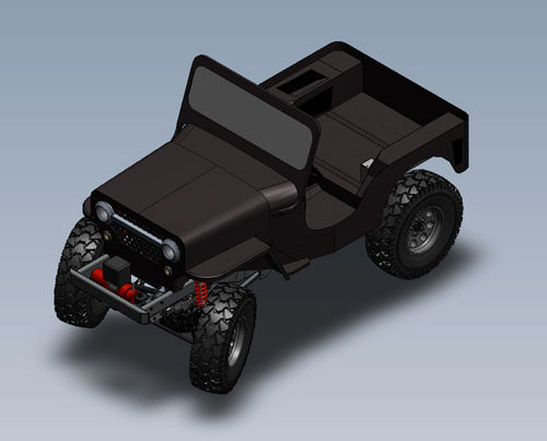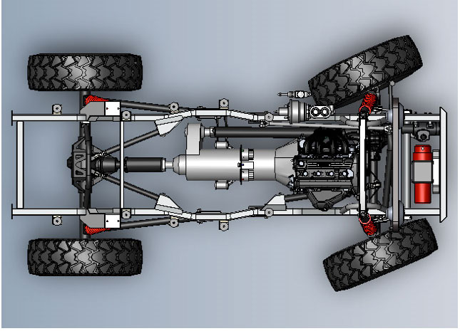 We designed this one in SolidWorks form scratch, with a dedicated coil suspension chassis, production Rubicon axle assemblies, Jeep application AX15 five speed and New Process 231 transfer case. Target weight of 2400 lbs, 260 HP. We will build a dozen or so as full turn key vehicles, thus refining the process to allow for clients to purchase it in “kit form” – Jalopnik