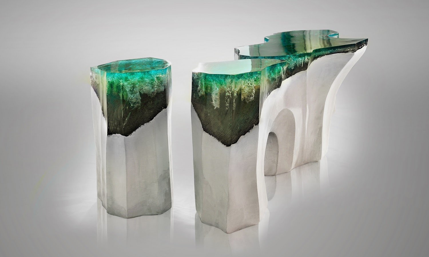This piece is a more vertical design, resembling a mountain lake or cliff (which makes sense, considering “La Falaise” is French for “The Cliff”). Inspiration came to him after walking the Failaise d’Etretat of France’s Northern Coast, seeing the beauty and contrast of the landscape. All of the components were cut from a single block of Jesmonite before having the top portions painted with various volumes and shades of acrylic paint. Depending on the light conditions, the benches and table emit different color hues. It’s also pretty handy that the benches are made to fit into the edges of the side table like a jigsaw puzzle. Eduard tells us that this is…