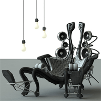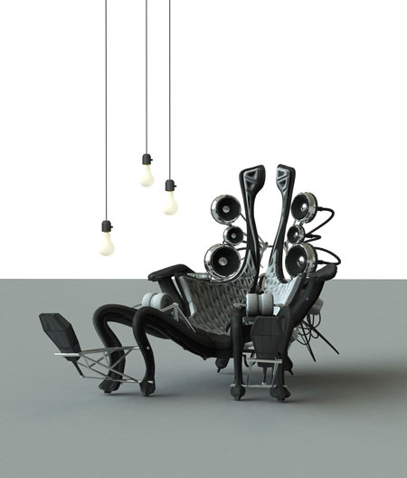 The idea? That this chair would be installed in shanty town shacks and run down buildings to… “provide for the basic needs of the 21st century human being.” Like surround sound, tubes and uncomfortable child-birthing positions.