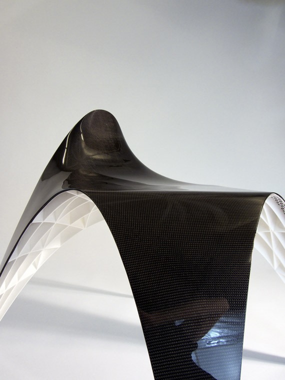 The chair is from Dutch designer Bram Geenen and as mentioned above, it was printed using selective laser sintering (SLS) with a lay-up of carbon fiber across the top surface. A software script was used to calculate the rib pattern you seen on the underside. The direction and amount of force determined the layout and height of the ribs. It’s a beautiful example of the visual nature of analysis and how it can be applied.