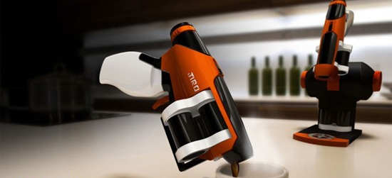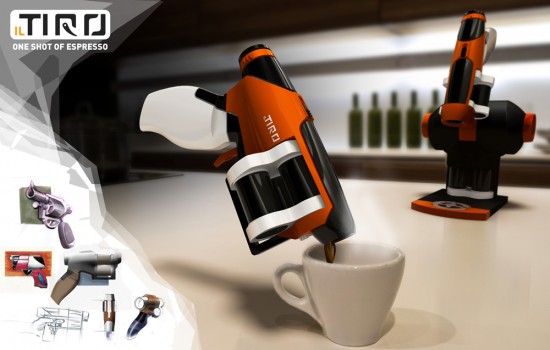 The design is a semi-auto espresso maker, that provides one shot of espresso with each round. Fill the water tank in the handle, set the desired temperature on the hammer, pull the espresso making trigger. You have three shots you’re able to load into the removable cylinder and a beautifully angled, cylinder recharging, docking station to mount the piece of art in your kitchen. Hands down, one of the most innovative design to happen with coffee since someone decided to burn the bean. I have no doubt this will make it to the store shelves and then to a holster under each arm.