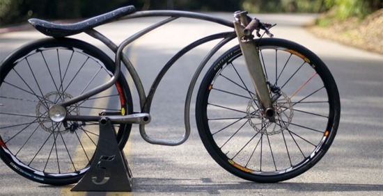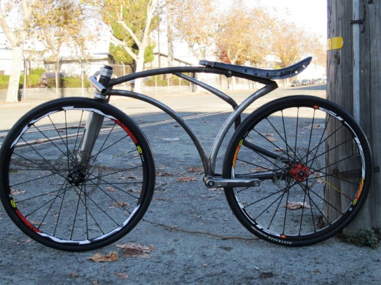 Jeff Tiedeken of Monkey Likes Shiny knows the feeling and he’s bringing the rawk home in the slick, clean flavor of welded aluminum. He calls it the Gravity Speed bike, a project the Aerospace welder/party animal has been working on for the better part of the year. It’s made for pure speed – no chains, cranks or pedals to hold you back. Just beautful curves and a banana seat that holds your buttocks millimeters off the rear wheel.