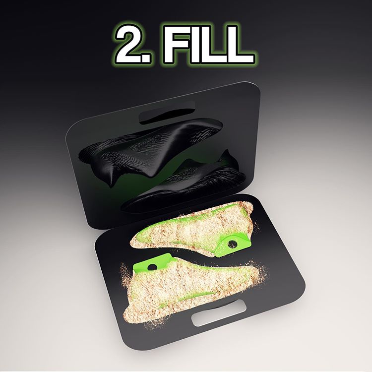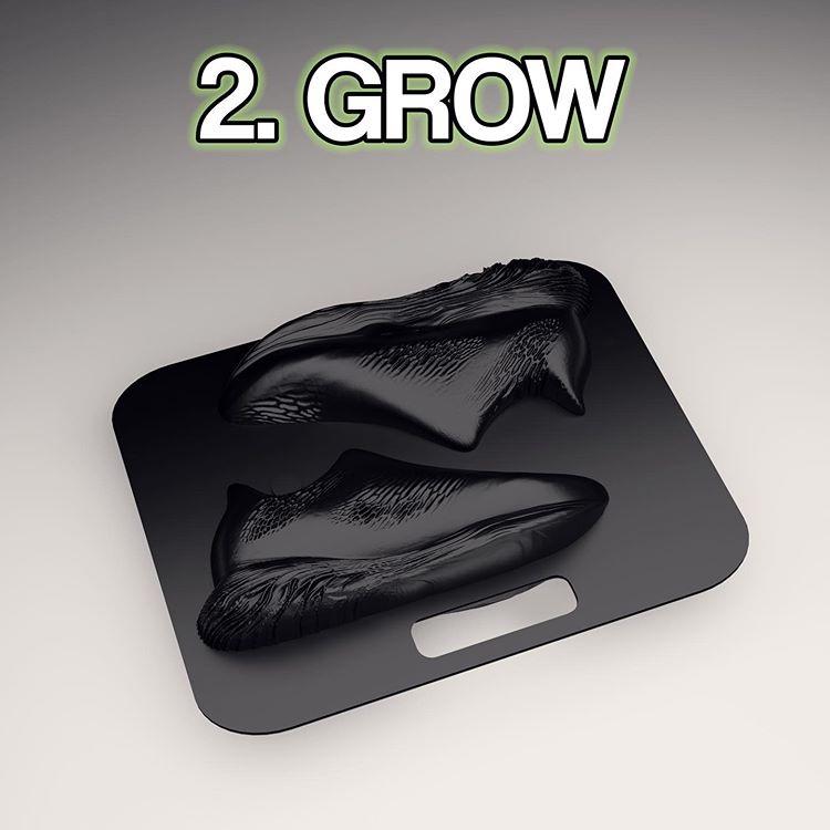 His concept is basically a kit that contains a clamshell pre-form foot mold and combination inner last/packaging which holds the organic growth ingredients. We’re not exactly privy to @23_heels’ manufacturing intention or material selections, but he looks to be making use of thermo-forming processes. Also growing the shoe using bioprocesses, replaces the current trend of additive manufacturing to produce highly organic shapes.