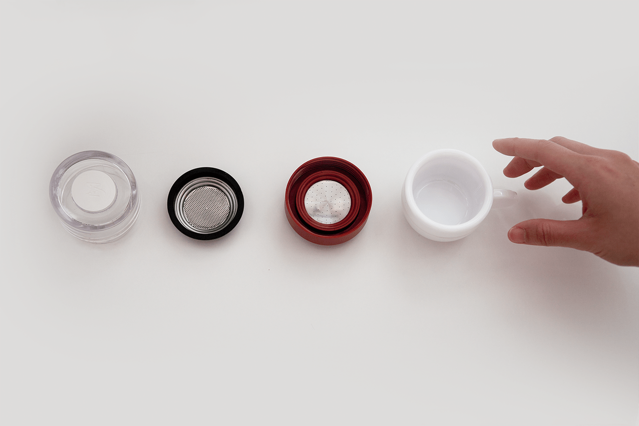 Consisting of an espresso cup and attachable filter and water chamber, the unit operates through the simple property of pushing water through the filter and coffee grounds before dripping it back into the cup. All that is seemingly required of the user is to source their favorite ground espresso blend, insert the filter and measured coffee, fill chamber with water, and microwave for 30 seconds: