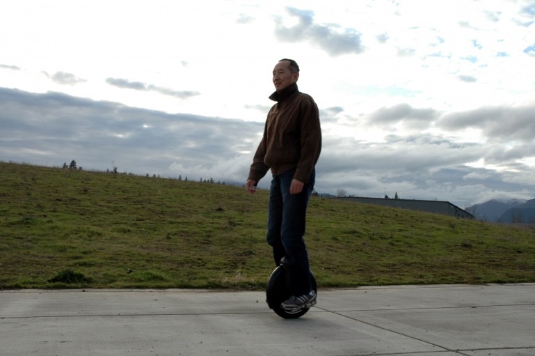 The breakthrough is in the design. Your feet are set very low to the ground and close to the wheel, with leg pads for your lower legs to rest against. This way, the lower part of your body is ‘fused’ to the wheel as if you were skating on one foot. The human foot has a small mass so it is easier to rotate and manipulate independently of the body than the larger mass of the hip. Using your feet to steer and balance is much easier than using the hip which all other auto-balancing unicycle’s draw on.