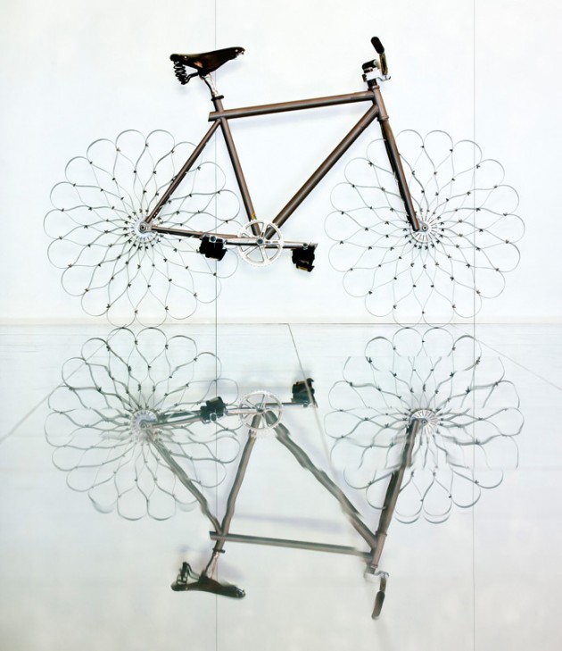 “The wheel uses 18 individual strips of steel that are pinned at various tension points to act together as one single unit. “We’ve actually done very little with the material,” Hearst tells Co.Design. “When you bend that steel, the way you pin it, you create natural curves. It’s almost like a flower.” The adjacent “spokes” create an additional shape that your eye naturally wants to fill in.” – Fast.Co