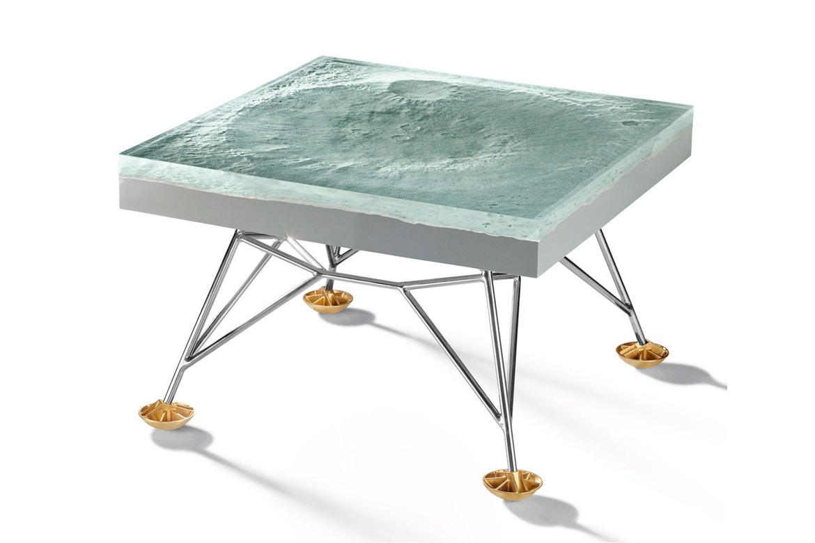 The table, which consists of molded fiberglass covering a lunar crater, was created using digital images from NASA’s archives to accurately recreate the surface of the moon. The space motif continues on down to the legs of the table—which are modeled closely after those of actual moon-landing spacecraft.