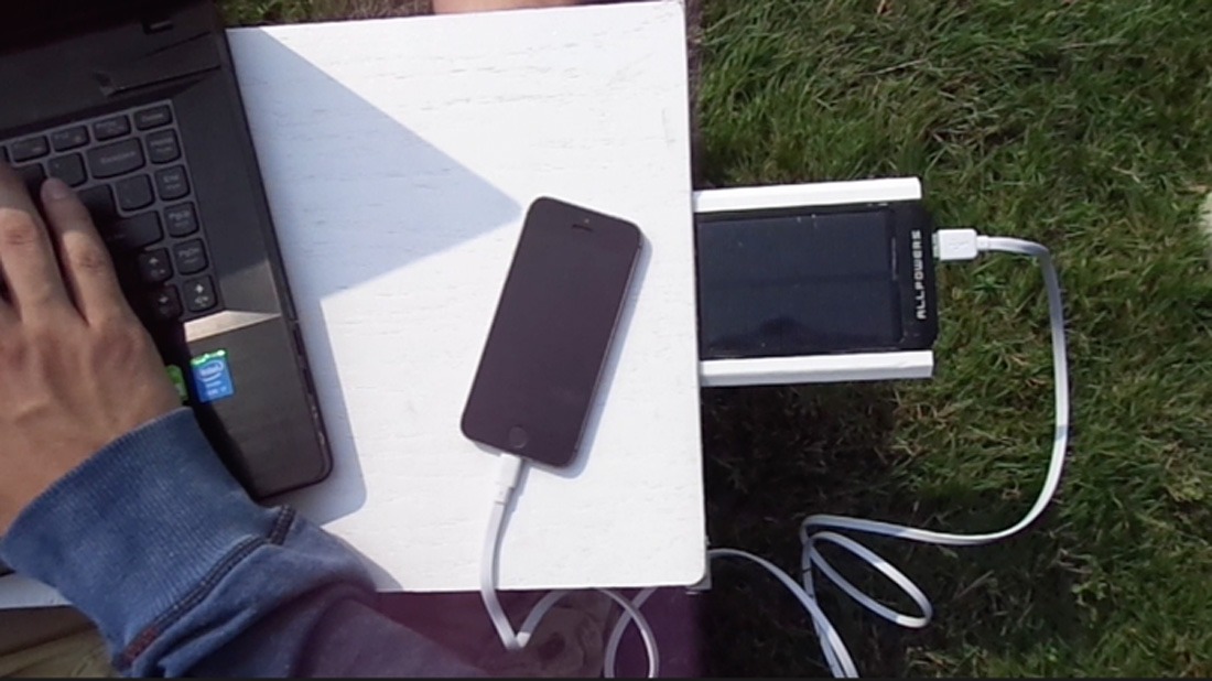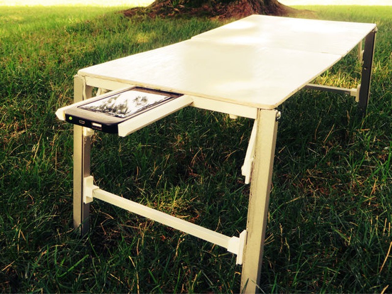 Details on the Kickstarter Campaign explain that Flexidesk is portable, solar powered workstation that folds up. It fits snug in your backpack and charges your electronic devices at the same time. The essential highlights include a Solar Panel, Telescopic Legs, Cup Holder, Elastic Interlocking system, External Battery Pack and USB Charger.