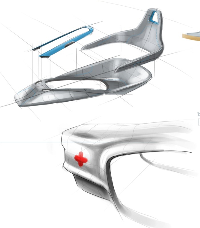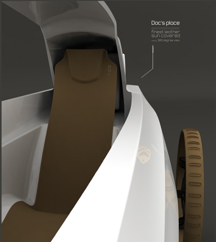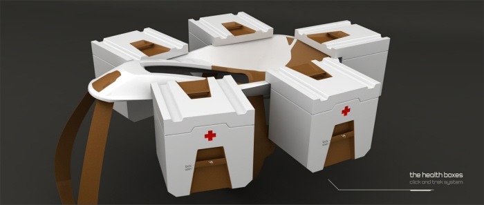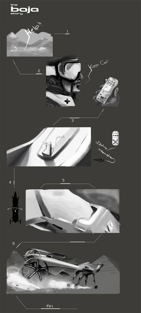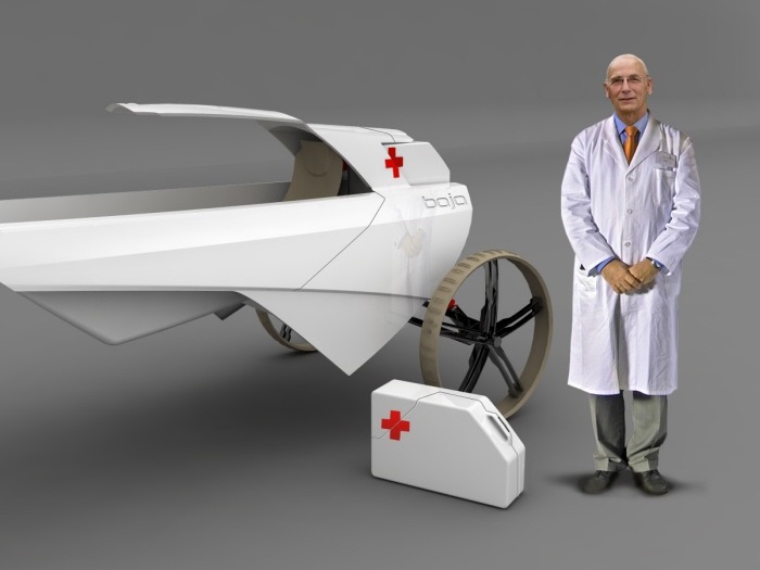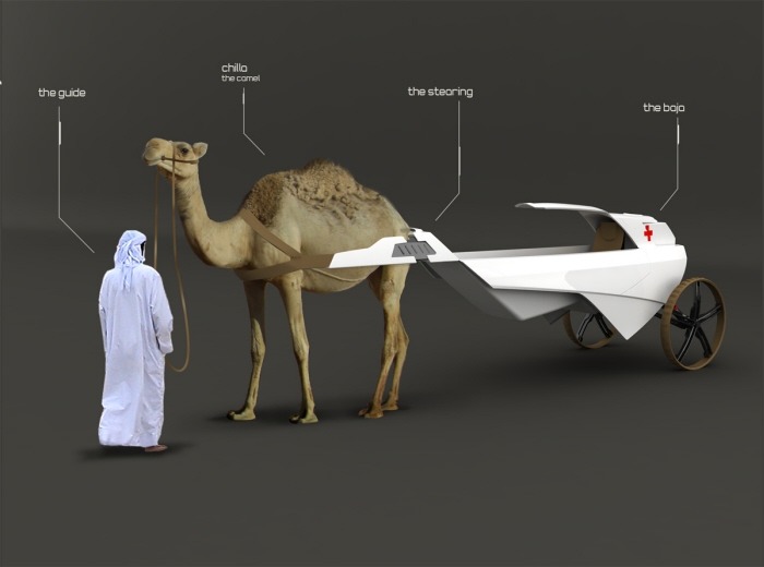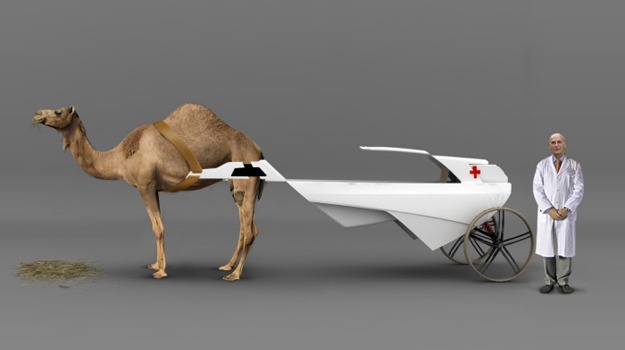 The Baja is a camel-driven, medical transport designed around a Dromedary (one-humped) camel. While using camels to transport wounded isn’t new, this certainly modernizes the design. Medical supplies can be mounted to a carrier strapped around the hump of the camel or switched out with a cacolet for transporting people. The main feature though is the two-wheeled Baja cart trailing behind the camel for the Camelier/Physician. The cart is outfitted with GPS, leather seating, Desert grip tires, long-travel shocks and cooled medical cases in the off-chance you’ll need to get organs out to that desert oasis stat.