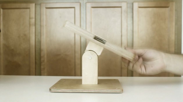 He came across a wooden iPad stand on tinkeringMonkey.com. Perfect… except for the price tag. Instead, he snagged some oak plywood, measured twice and cut out the various pieces using a table saw, a jigsaw and concentrated batches of joyous laughter. He completed the look by banding the edges with oak veneer, then applying generous layers of stain and shellack. As you can see, it came out beautifully.