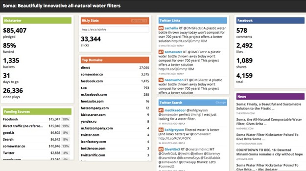 Designed by the same intelligent fellows who brought the Soma Water Filter to market through their own Kickstarter campaign, the dashboard offers pretty much everything you could want to know about your campaign in a single interface. Inspired by the dramatic influx of tweets, Facebook posts, blog mentions, and emails within the first 36 hours of the launch of their Soma campaign, the team describes the experience as “nuts”: