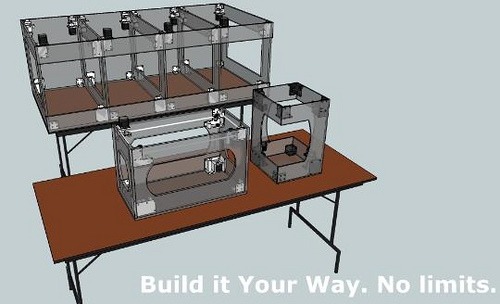 The heart of the Maxifab framework consists of a set of plastic parts that hold the key functionality of the machine and allows for an almost limitless choice of case materials, designs, and dimensions. Using the Maxifab framework, the end user can build his/her machine from anything ranging from plywood to carbon fiber, and as small as a shoebox or as big as a refrigerator -the build envelope is directly related to the case size. And since the plastics, motors, electronics, bearings, etc are reusable, it is possible to start small and expand later.