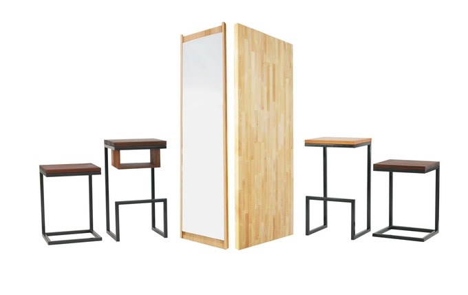 VARIA isn’t some math-defining furniture set, but rather set made from six pieces: 2 stools, 2 barstools (one with a removable cabinet slot), 1 slab of wood, and 1 full-length mirror. It is from these six unlikely pieces that you can create the 25 pieces as mentioned above of furniture.