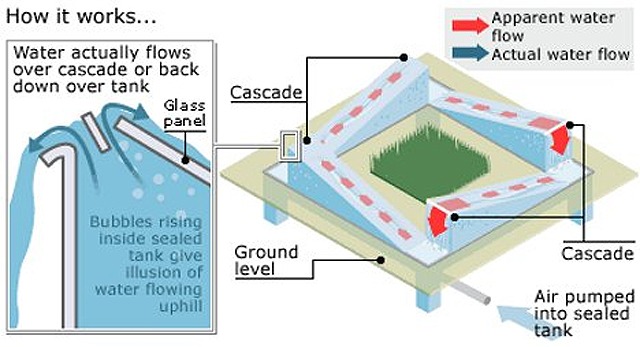 Ready for this? It’s a fountain inspired by MC Escher’s Waterfall. What does it do? Provides a continuous flow of water flowing uphill, or so it seems. First shown nearly a decade ago for the Royal Horticultural Society’s 2003 Chelsea Flower Show at the beautiful Chelsea Showgarden in London, The Wrong Garden is James Dyson’s feat of engineering brilliance and impossibility. How does it happen?