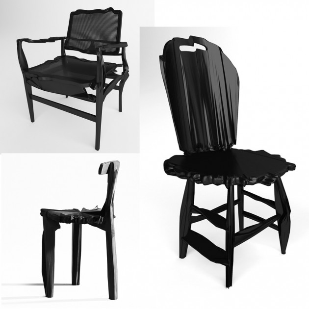 The first step to this process began in the streets of the Grajau, Tiradentes and Santa Ifigenia areas of the city. After wandering about and collecting samples, Studio Guto Requena took the CAD files of these three iconic chairs from Brazilian designers and interlaced the waveforms with the chair forms.
