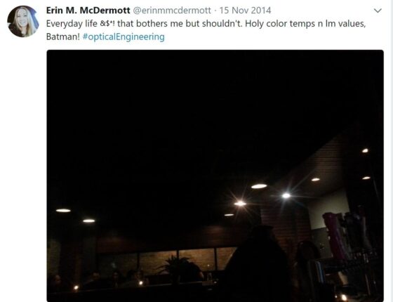 To illustrate this affliction, let me lay bare my own suffering. I give you Exhibit A: me totally distracted in a bar in Chicago by the ceiling instead of the bourbon. This was a tweet from 2014 when I was working fulltime in designing optics for this kind of lighting.